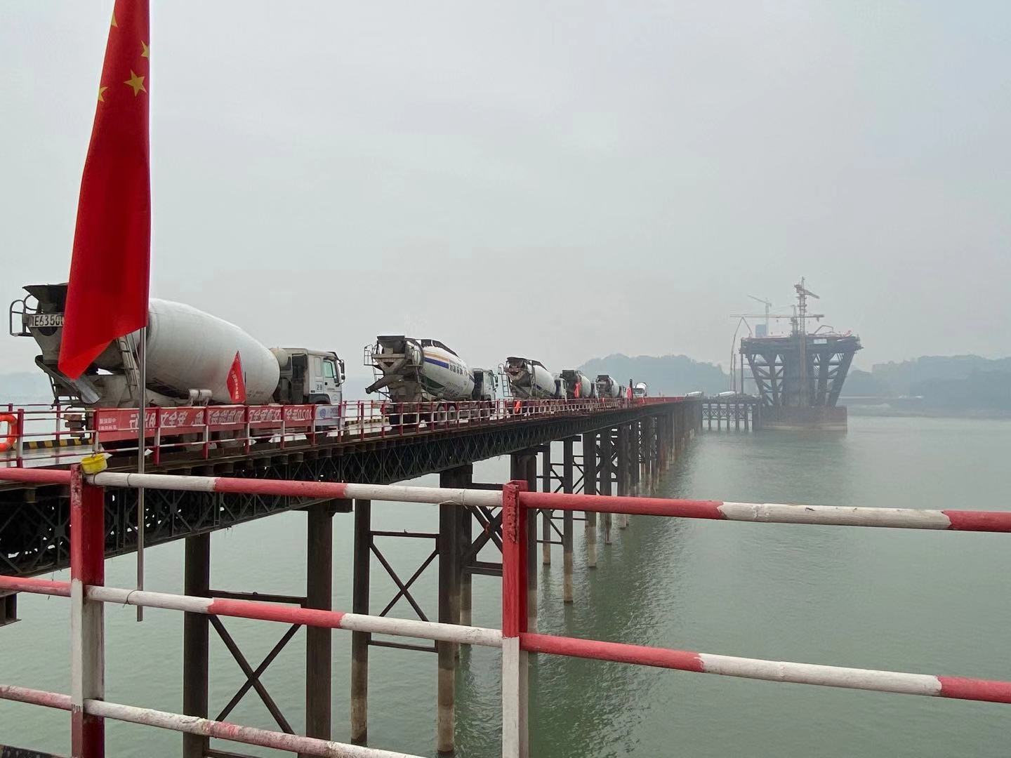 建材科技公司近期為正橋工程橋跨承重結構斜拉橋的主梁拉索支架上澆筑混凝土主梁MP4段混凝土主梁供應建科混凝土