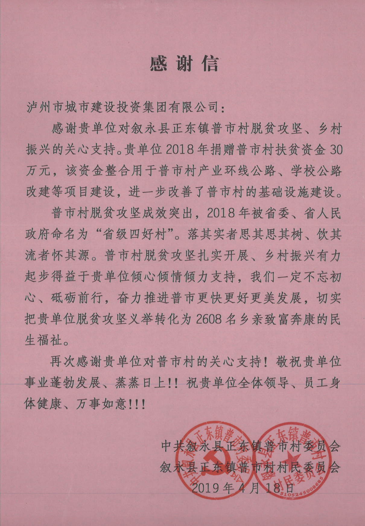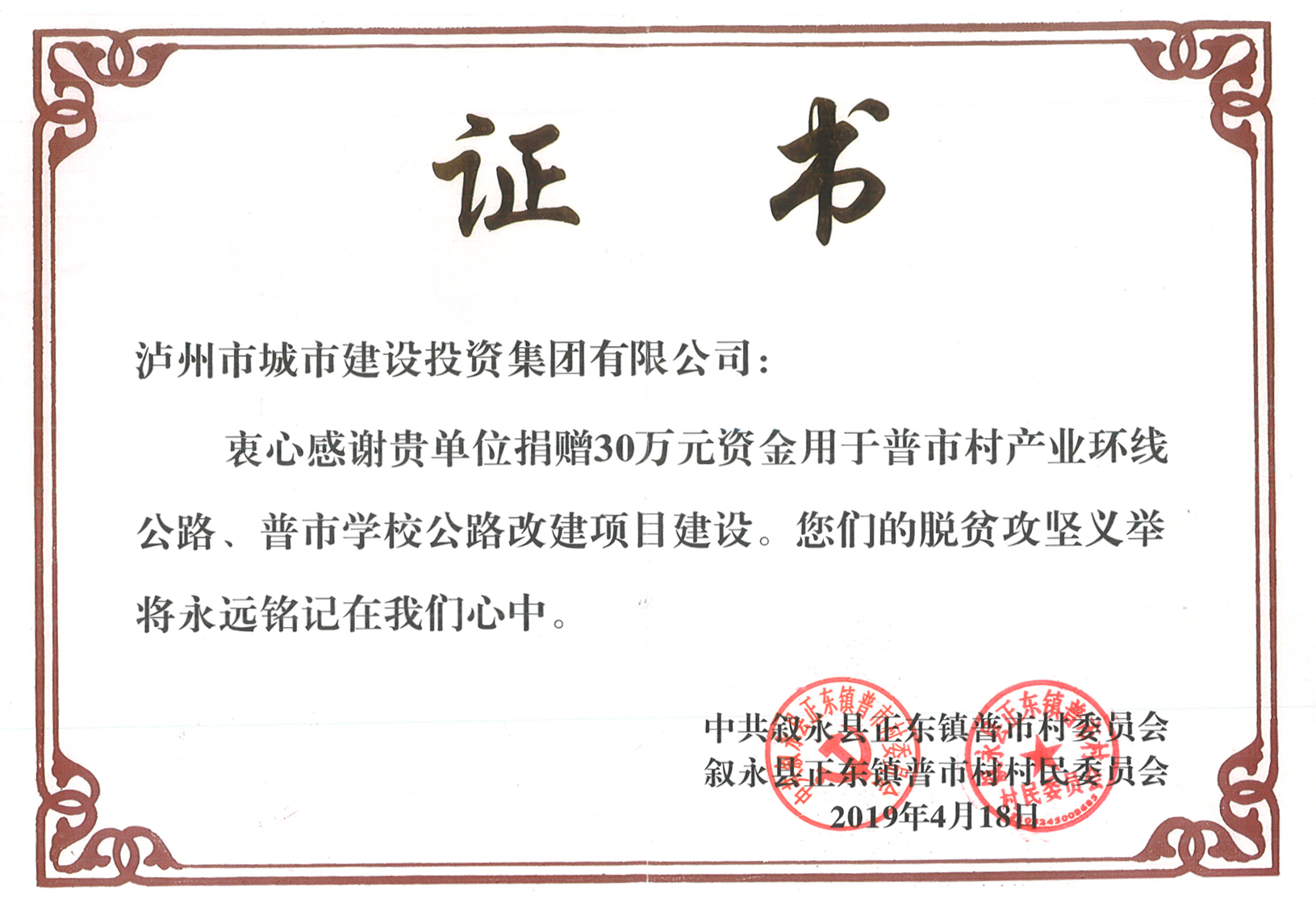 近日,瀘州城投集團(tuán)收到敘永縣正東鎮(zhèn)普市村支部、村委會(huì)聯(lián)合發(fā)來(lái)的捐贈(zèng)證書(shū)和感謝信,對(duì)瀘州城投集團(tuán)2018年捐贈(zèng)該村30萬(wàn)元助力脫貧攻堅(jiān)表示感謝。