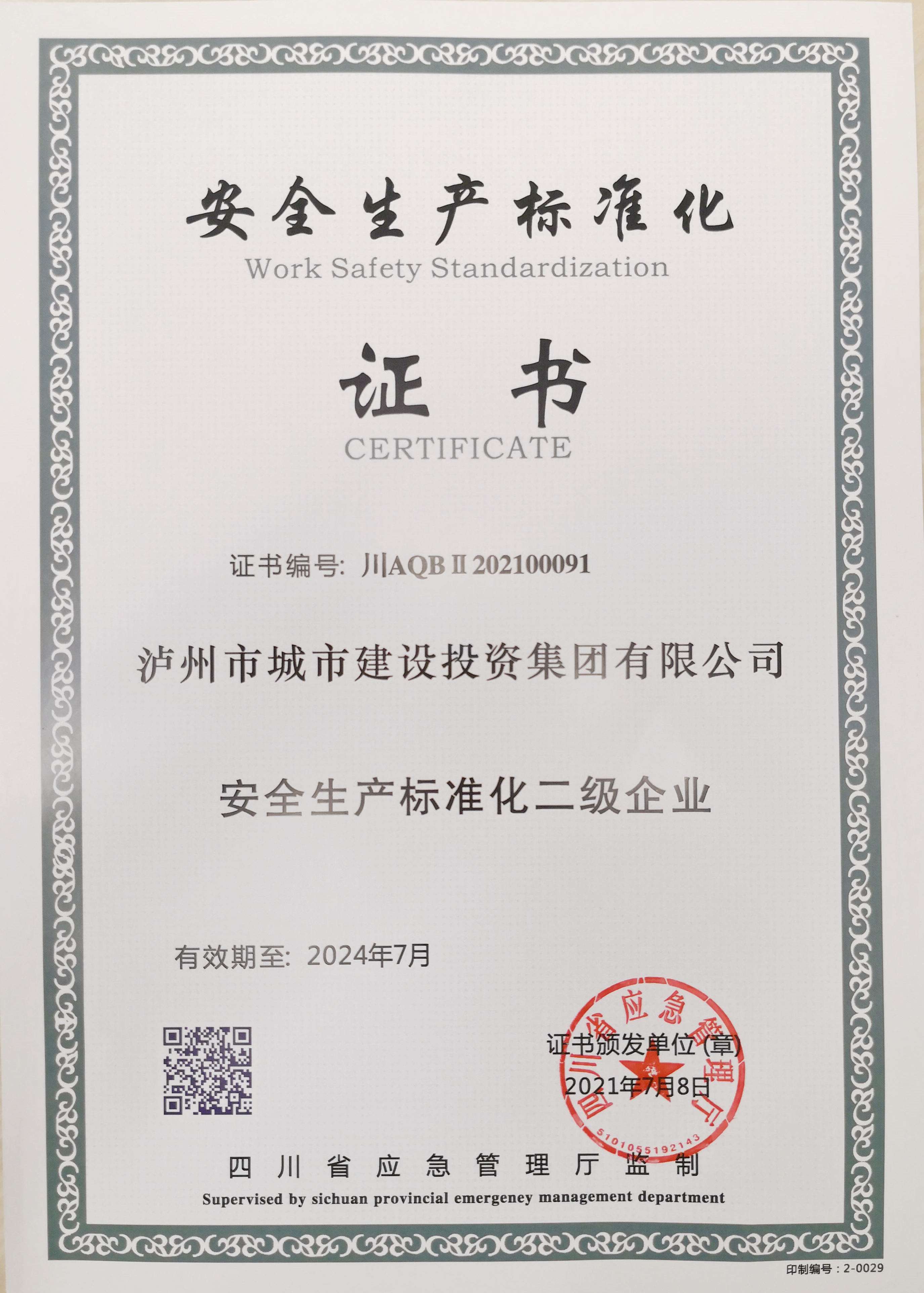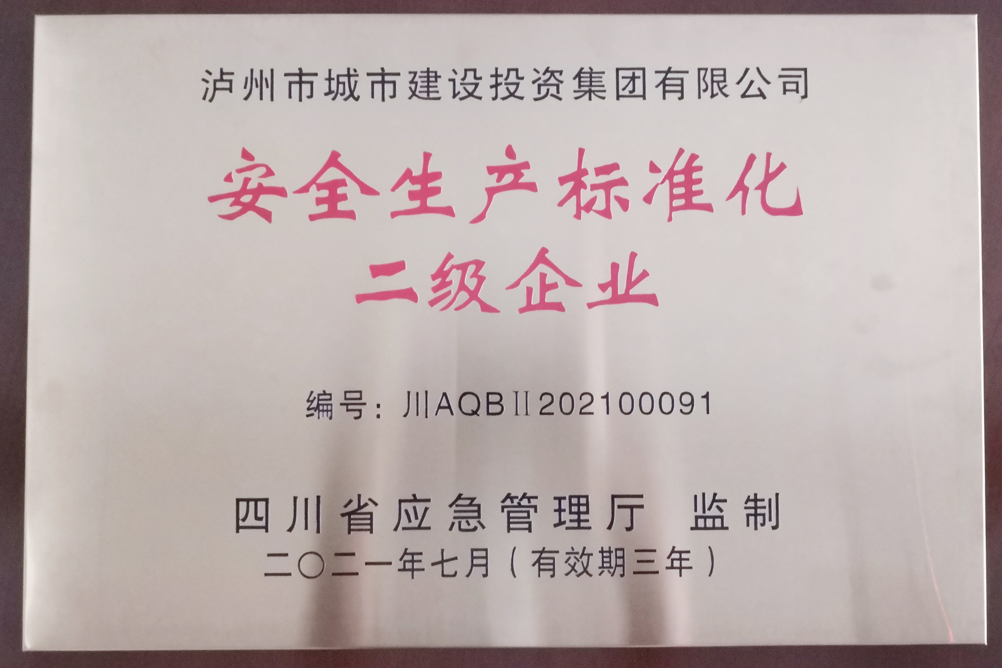 瀘州城投集團(tuán)榮獲安全生產(chǎn)標(biāo)準(zhǔn)化二級(jí)企業(yè)稱號(hào)