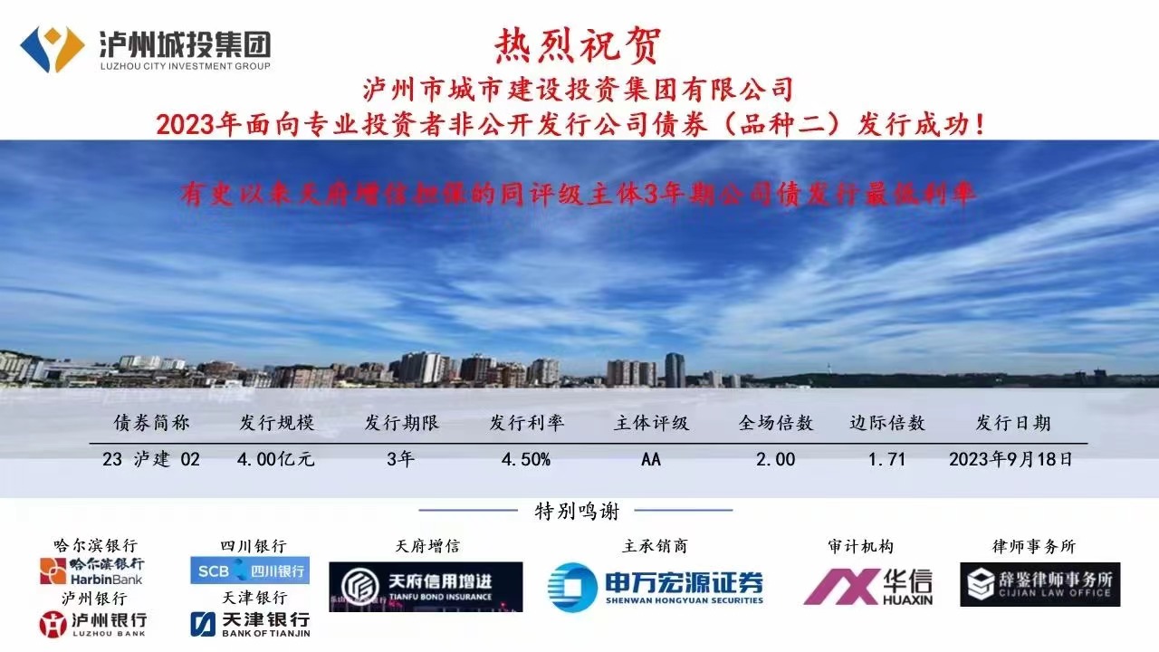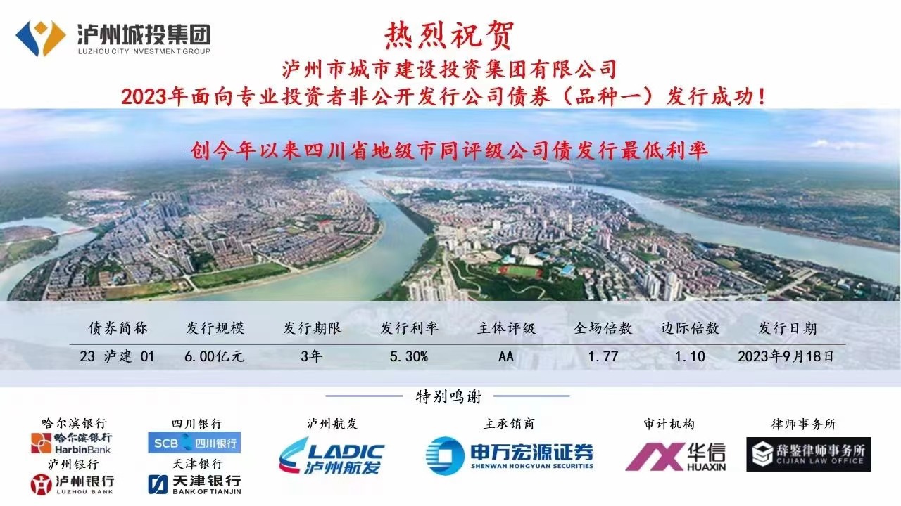 9月18日,瀘州市城市建設(shè)投資集團(tuán)有限公司(以下簡(jiǎn)稱城投集團(tuán))2023年非公開(kāi)發(fā)行公司債成功發(fā)行,債券規(guī)模10億元,得到了哈爾濱銀行、四川銀行、瀘州銀行、天津銀行以及各類券商、信托等非銀機(jī)構(gòu)投資人的關(guān)注和參與。