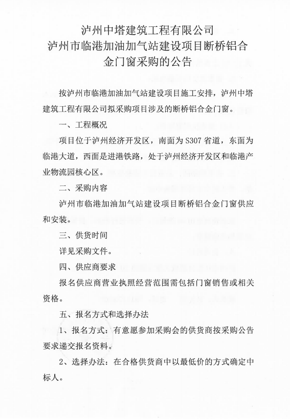 瀘州市臨港加油加氣站建設(shè)項(xiàng)目斷橋鋁合金門(mén)窗采購(gòu)的公告