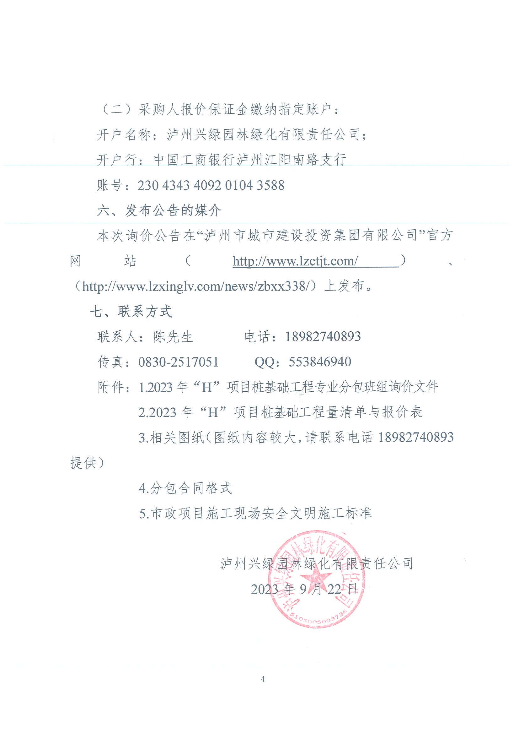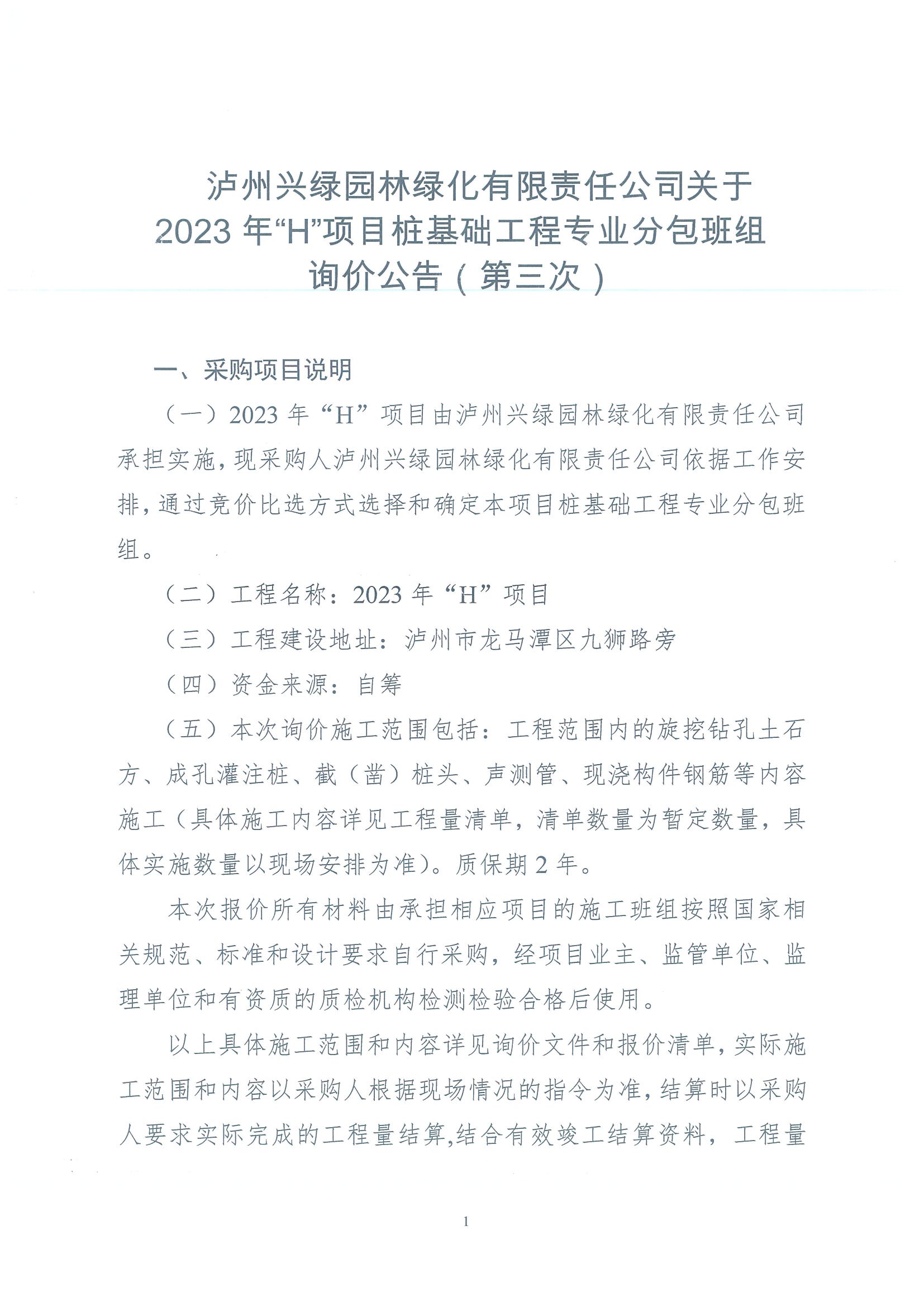 2023年“H”項(xiàng)目樁基礎(chǔ)工程專業(yè)分包班組詢價(jià)公告(第三次)