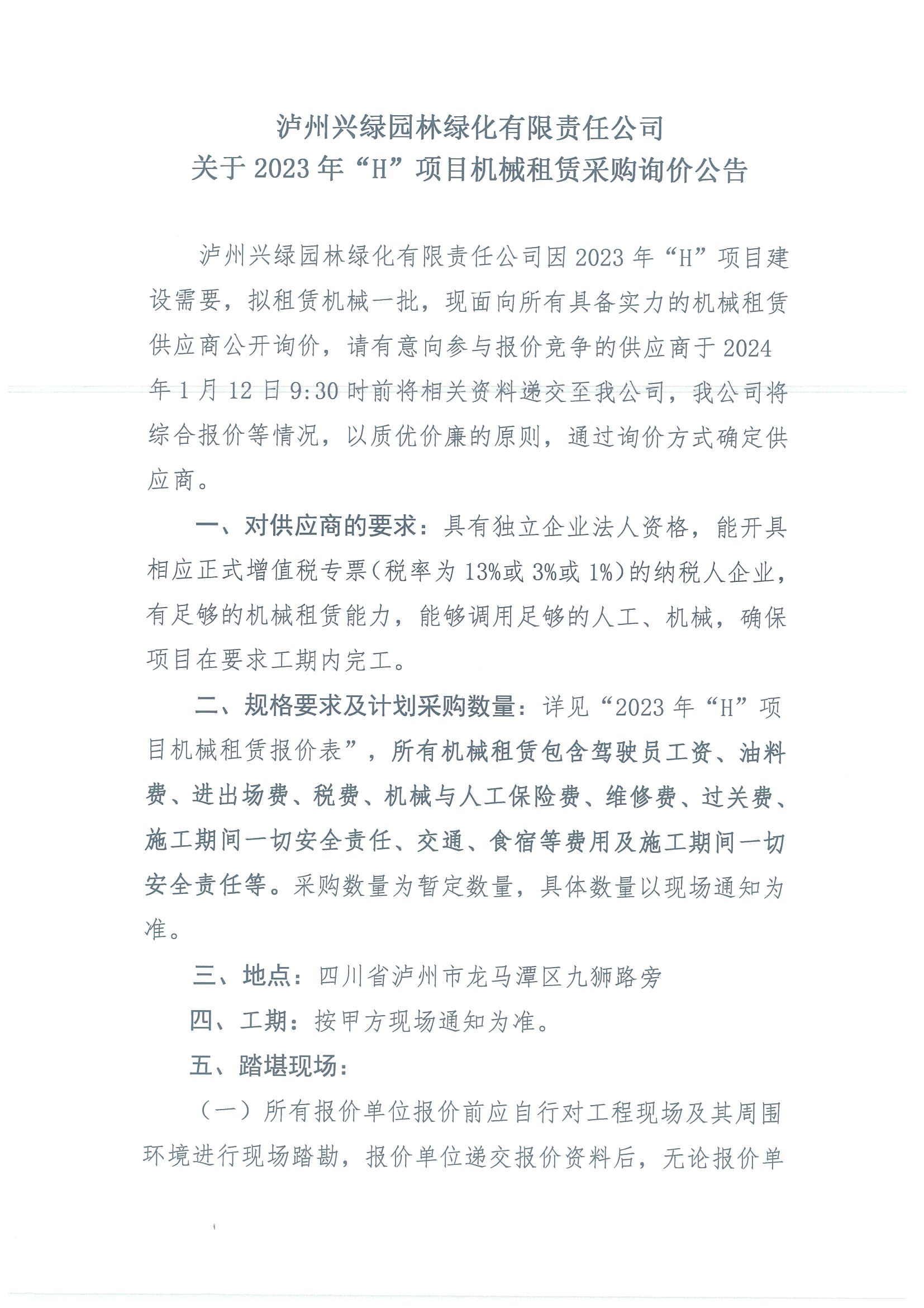 2023年“H”項(xiàng)目機(jī)械租賃采購(gòu)詢價(jià)公告