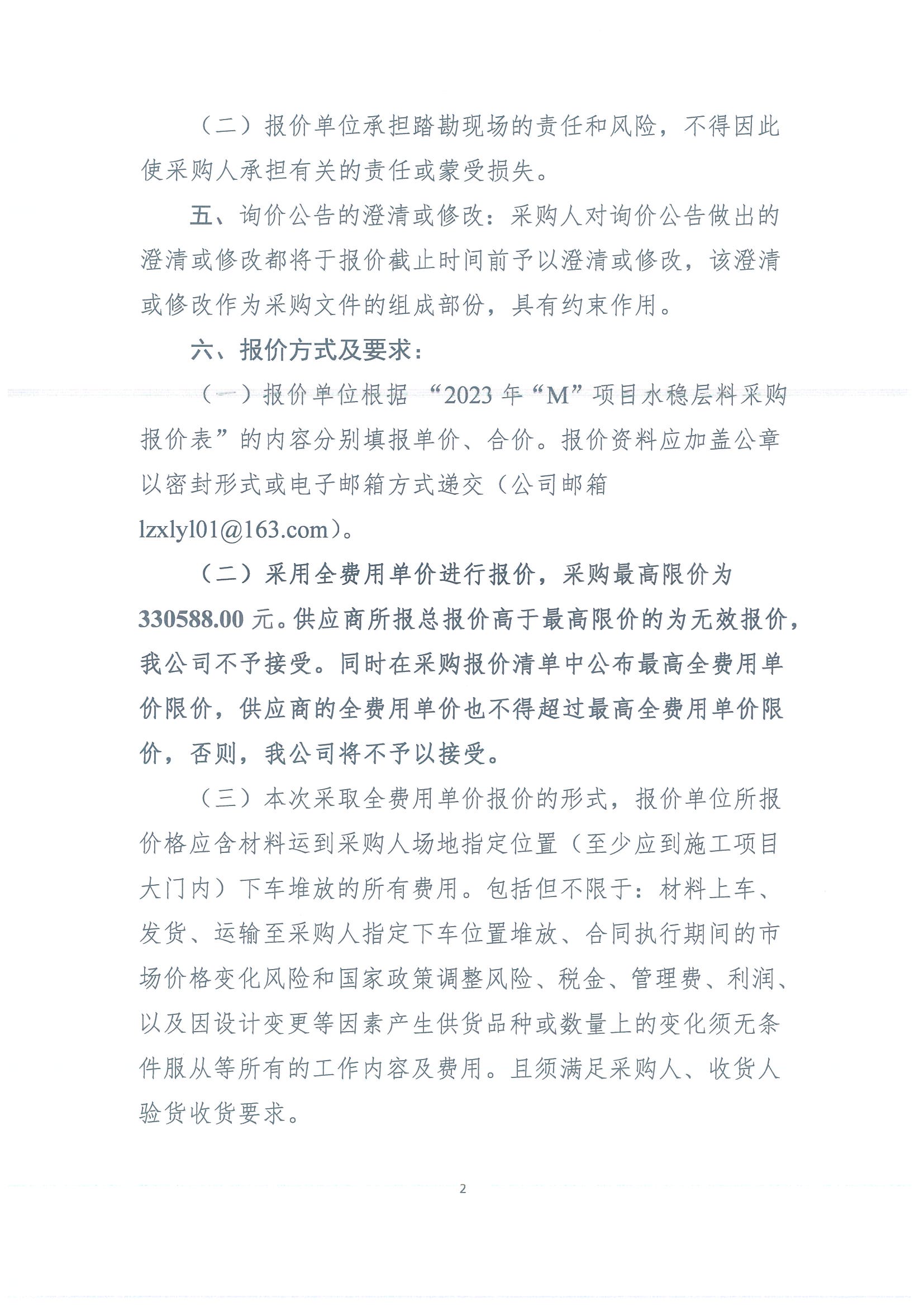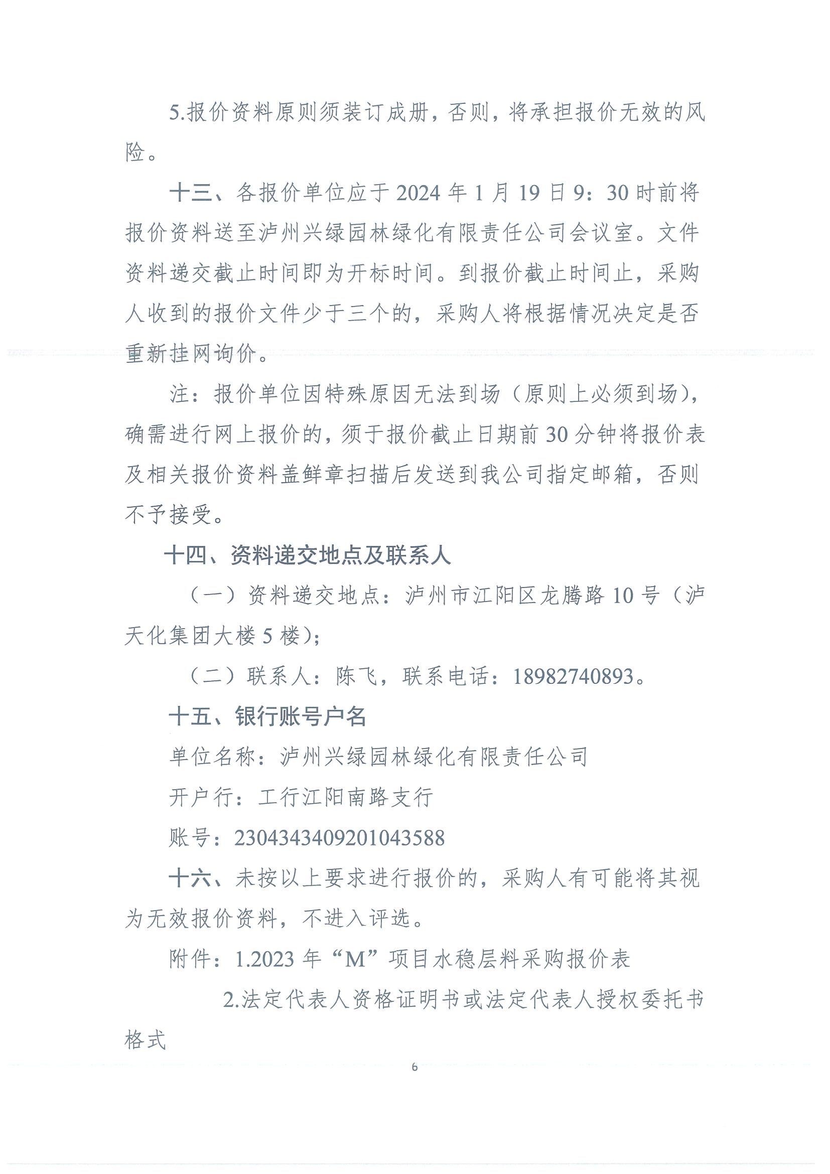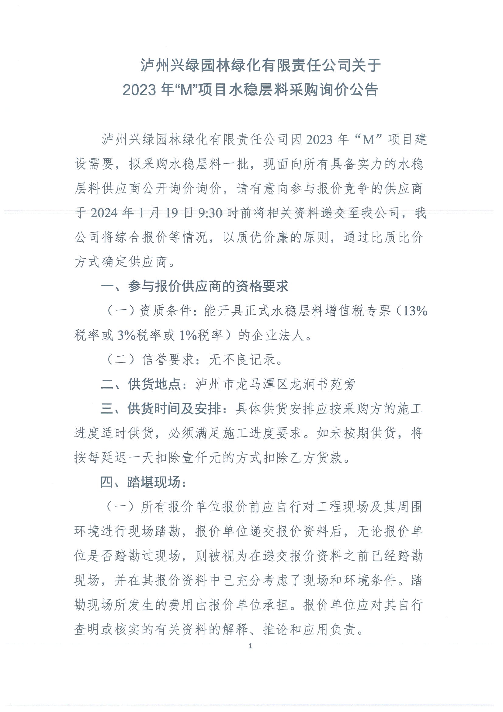 瀘州興綠園林綠化有限責(zé)任公司關(guān)于 2023年“M”項目水穩(wěn)層料采購詢價公告