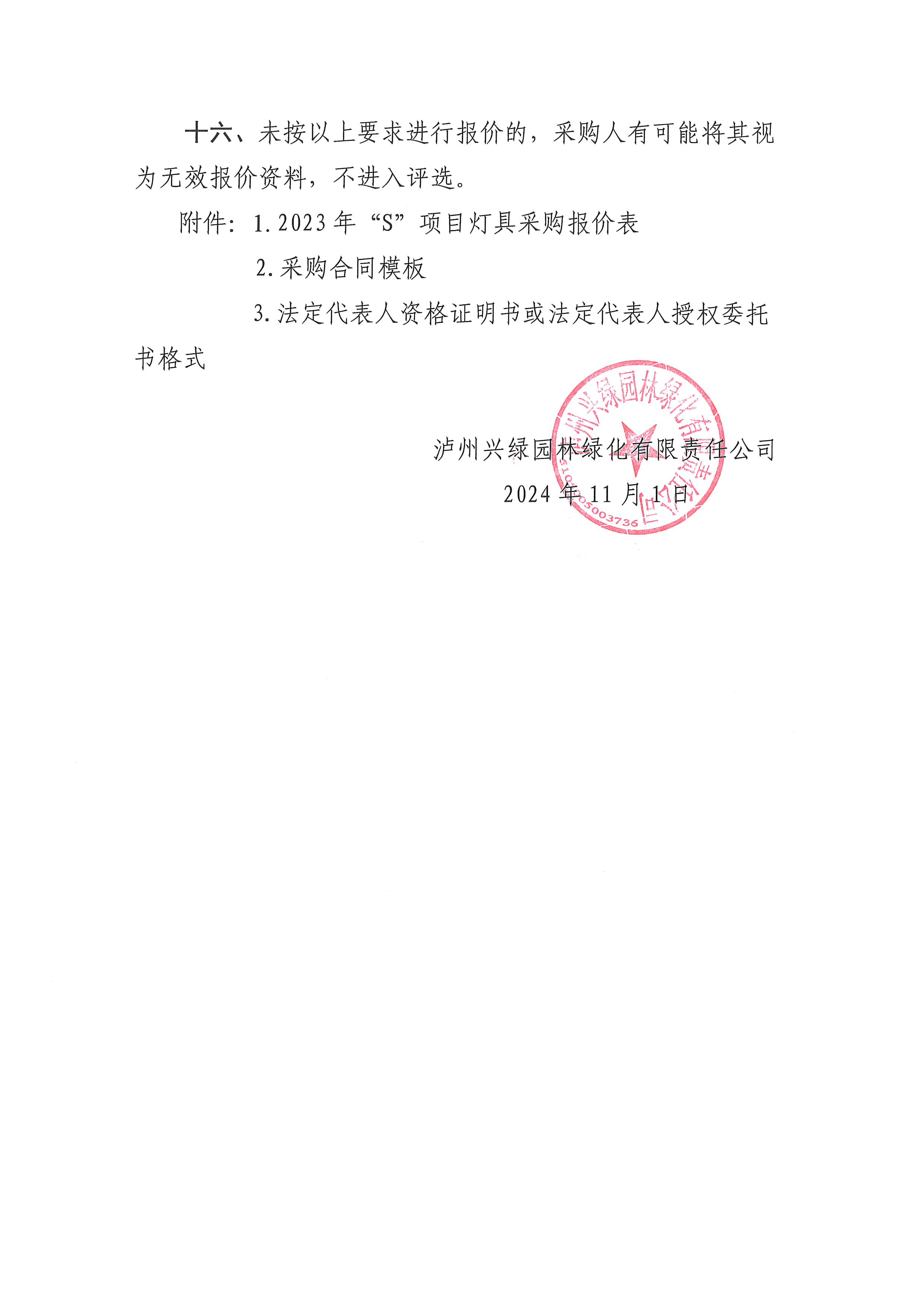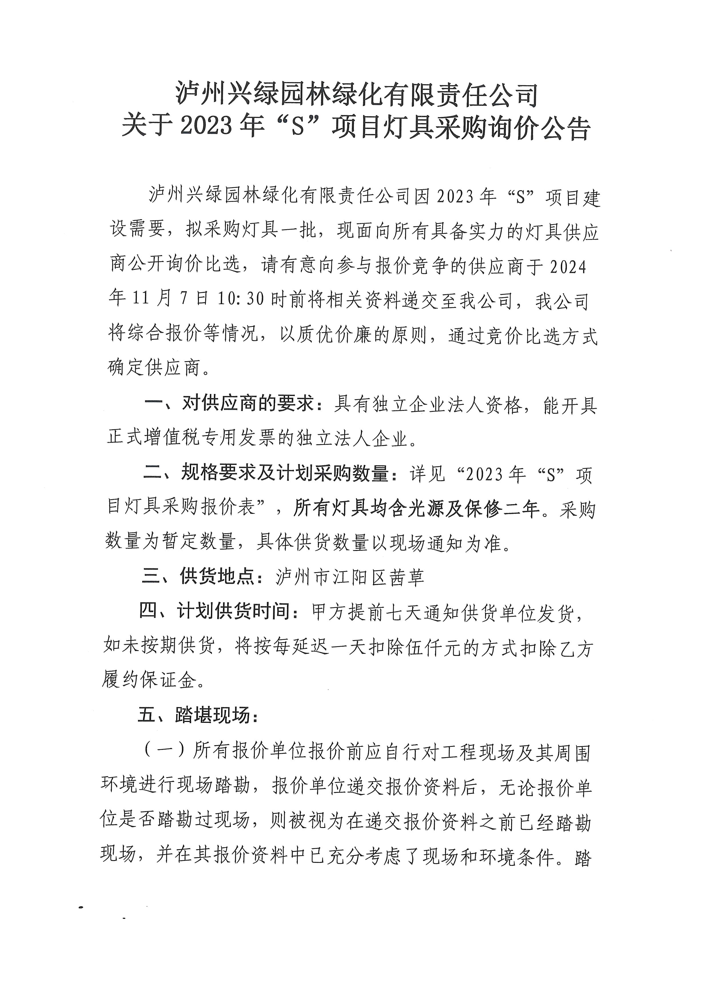 瀘州興綠園林綠化有限責(zé)任公司關(guān)于2023年“S”項(xiàng)目燈具采購詢價(jià)公告