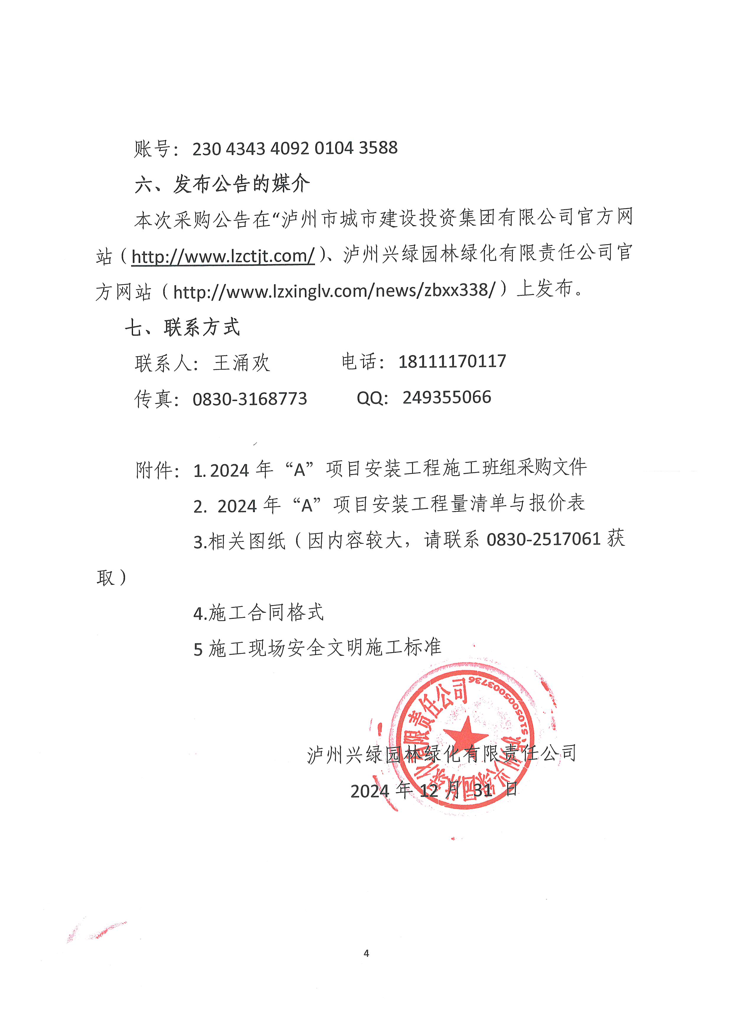 瀘州興綠園林綠化有限責任公司關于2024年“A”項目安裝工程施工班組采購公告